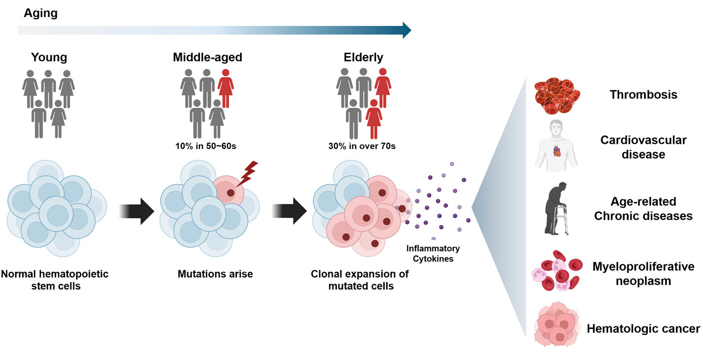 - Mutant immune cells derived from these CH clones excessively secrete inflammatory cytokines (like IL-1β and IL-6), creating a microenvironment throughout the body that is prone to inflammation. This chronic inflammation further promotes the expansion of the CH clone, ultimately accelerating what is known as "inflammaging" and "immune-aging."